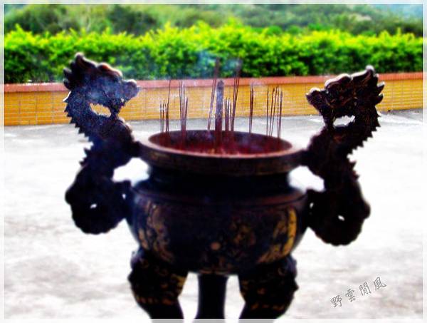 等著香柱緩緩燃焚的時間裡,我站在樓簷不停垂落雨滴的迴廊上,凝望著那些在紅磚圍砌成的焚爐裡,焚燒著信徒頂著落雨不斷放入的一袋袋紙錢 ~~~