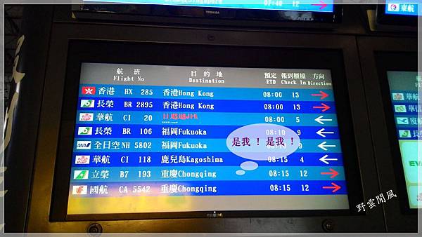 終於到了一大早06:15在桃園機場集合的時間,大伙兒都先後準時出現集合地點,看得出大家昨夜都沒睡好覺,但卻都精神奕奕地期待著這趟少有體驗過的行程。辦理好通關程序,再次叮嚀注意事項後,互約在C5R登機閘門相等。這是一個天氣多雲時晴的日子,我們準備搭乘08:15立榮航空直飛重慶去,預定11:35抵達重慶機場。