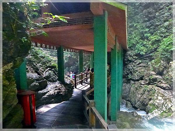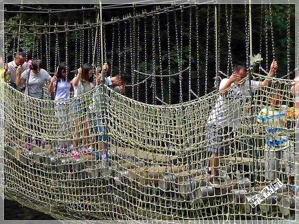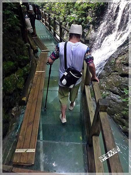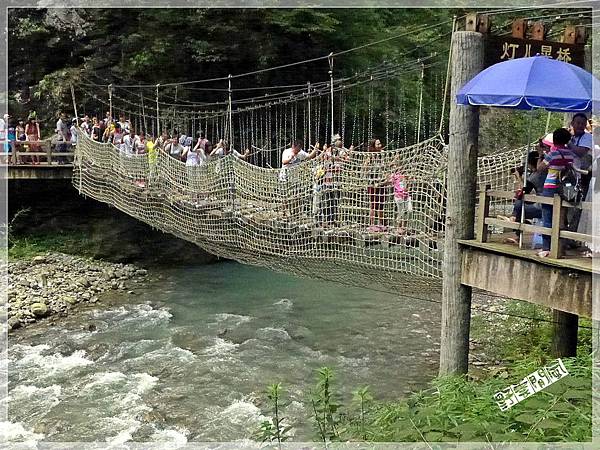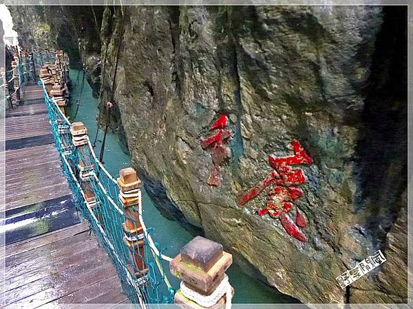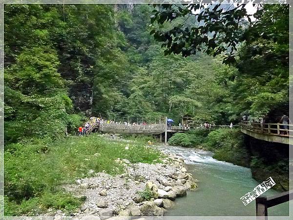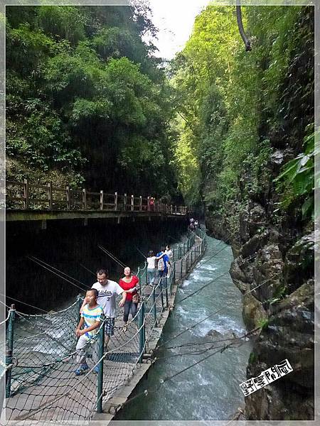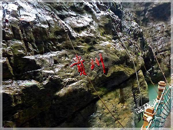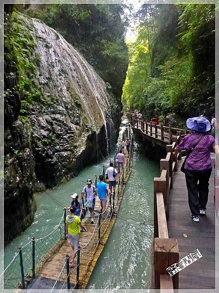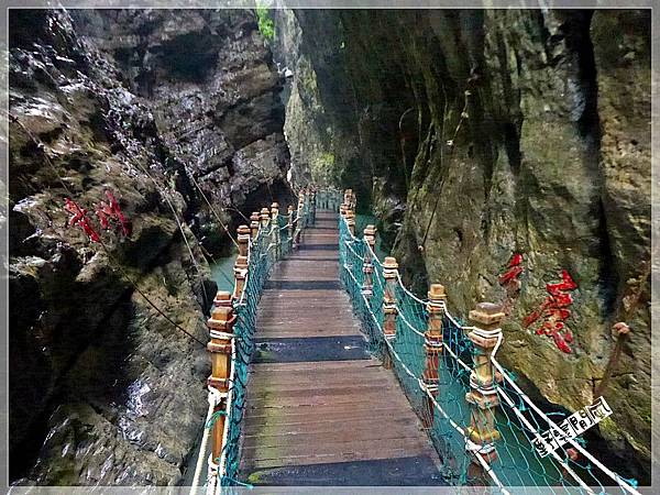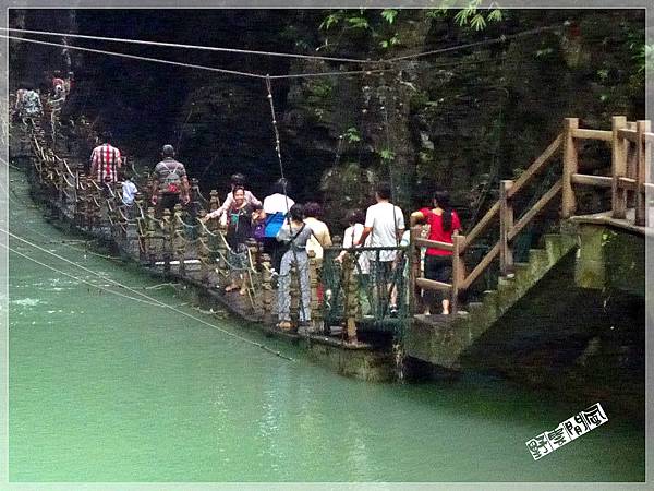 徒步中經過有趣的吊橋,更覺峽高谷深。據說在山谷中的負氧離子濃度達每立方釐米達11萬個以上,行走在堅牢舒適的棧道上,可以感覺到持續有著一股股送爽的清涼感,穿透毛細孔也沁人心脾。因為黑山谷地跨重慶及貴州兩地,因此走著走著,會在一座浮橋上看到兩塊碑石,一邊寫著紅色的「重慶」大字,另邊寫著「貴州」兩大紅字,於是只要雙手一張,就可以「左手摸重慶,右手攬貴州」,輕鬆跨省遊,煞是有趣極了。