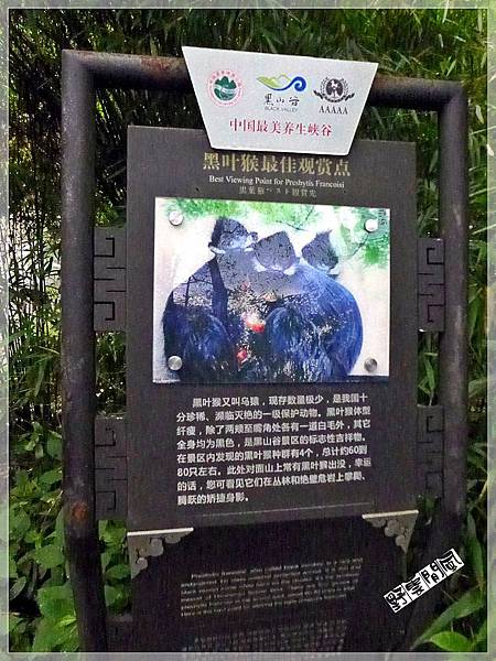 黑山谷二絕:黑葉猴和「猴積」。在黑山谷兩岸崖壁上,幸運的話,有時可望見一群群黑色的猴子在蹦跳嬉戲,因為生性害羞謹慎,往往一見生人,牠們便很快地躲進茂林密處,顯得特別神秘。這種黑猴子稱作「遺體黑葉猴」,又叫「烏猿」,是中國一級保護動物,十分珍稀,目前只有中國西南和越南北部有極少量的族群分佈。黑葉猴體長約50公分,頭小尾長,習慣群棲樹上,很少下到地上活動。就因為黑山谷原始森林分佈廣密,提供了黑葉猴非常適合的生存環境。從70年代發現第一隻黑葉猴以來,如今這裏數量已有上百隻。